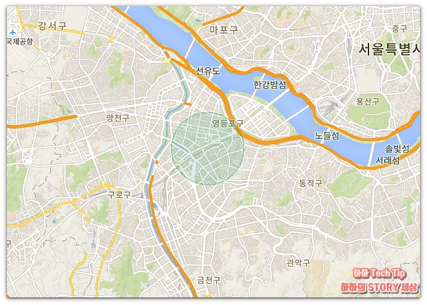 기기 위치는 보는 것처럼 신호가 감지되는 곳의 반경으로 표시되며 확대도 가능하다. 원의 중심과 스마트폰이 있는 곳과 약 50m 정도 차이가 있었으며, 이점을 참고한다면 좀 더 쉽게 기기를 찾을 수 있을 것이다.