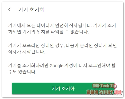 세 번째 기기 초기화는 상대방이 나의 기기를 돌려줄 의사가 없다고 판단되거나 내부 저장소에 노출이 되면 안 되는 민감한 사진, 정보 등이 있을 경우 기기의 모든 콘텐츠를 삭제한다. 초기화 실행 후 은 기기 위치 파악은 더 이상 불가능하니 신중히 생각하고 진행해야 한다.