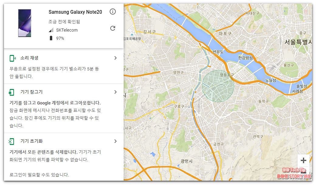 로그인을 마쳤다면 크롬 브라우저에서 '내기기 찾기' 또는 '휴대전화 찾기'를 검색한다. 화면에서 유저가 사용하는 스마트폰 모델명과 지도 화면이 뜬다. 만약 사진처럼 나온다면 위치정보 이용약관에 동의해야 기기 위치를 확인할 수 있으니 허용을 누른다.