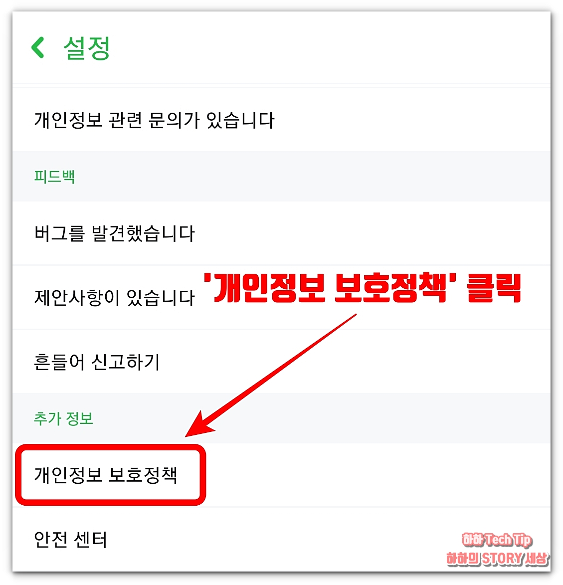 일반적인 경우라면 설정 부분에 회원 탈퇴 메뉴가 있지만 전혀 찾을 수 없다. 화면을 아래로 스크롤해서 추가 정보 -> 개인정보 보호정책을 찾아 클릭한다.