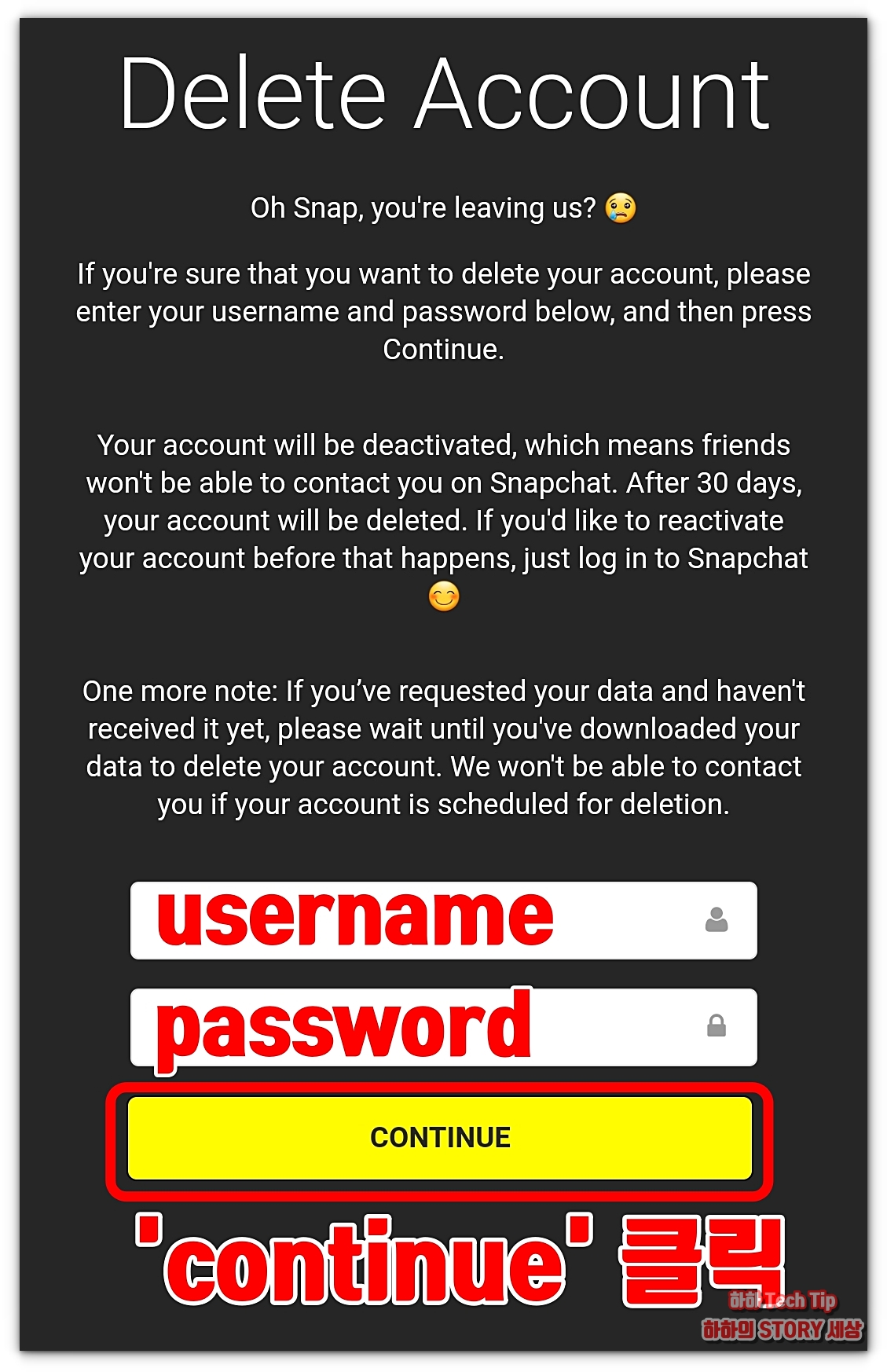흰 박스에 유저네임과 비밀번호를 입력 후 'CONTINUE'를 누른다. 계정은 즉시 삭제가 되지 않고 30일 후 완전히 제거되지 않으니 혹, 계정을 재활성화시키고 싶다면 스냅챗에 다시 로그인하면 된다. 그리고 계정 삭제 후 각종 데이터는 다운로드가 되지 않으니 미리 백업해야 한다.