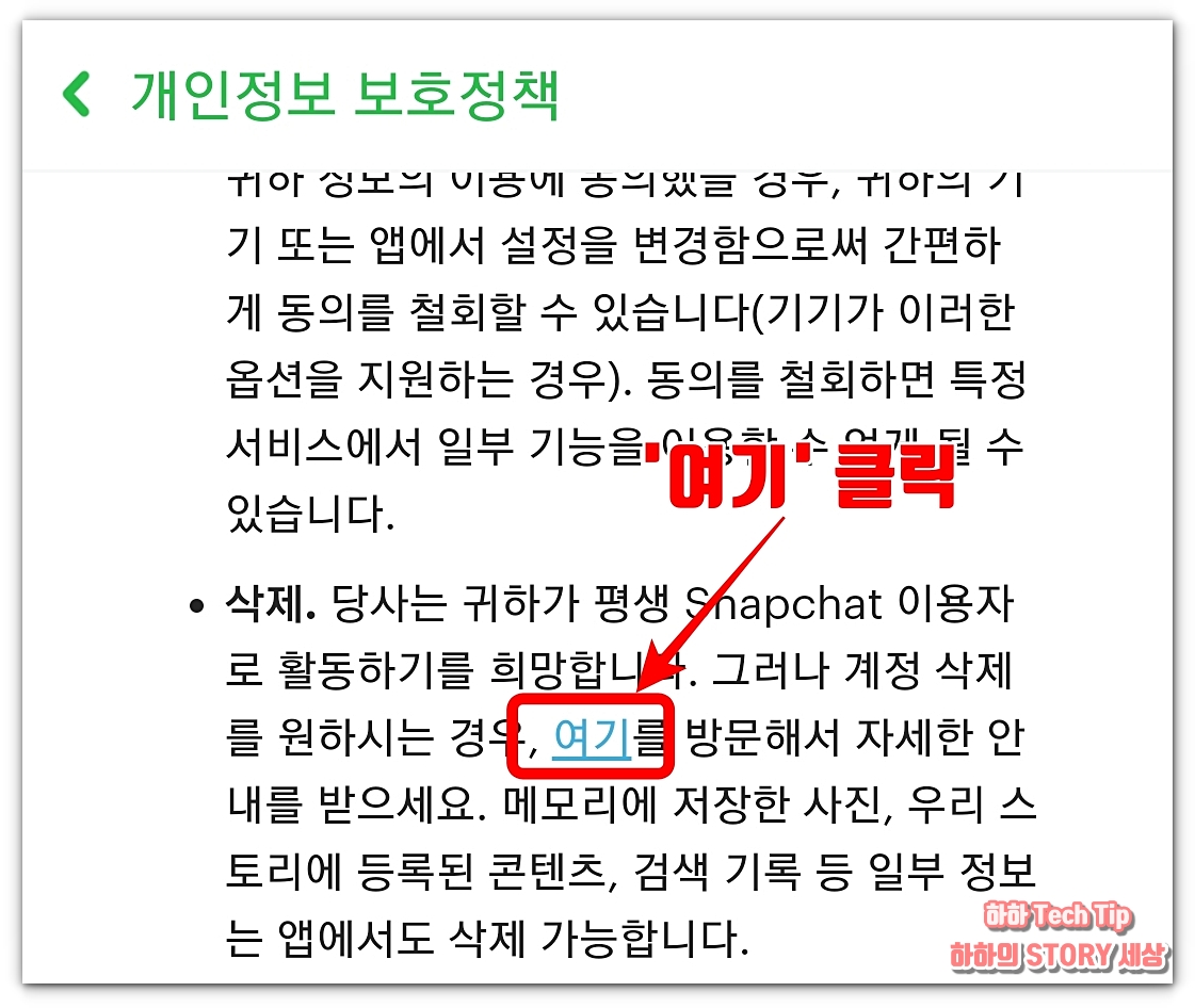 개인정보 보호정책으로 이동하면 아래로 스크롤해서 귀하의 정보 관리 항목 중 삭제를 설명한 내용 중 여기 부분을 클릭한다.