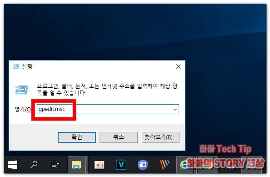 위 단축키는 실행 창을 오픈하는 기능을 하는데, 빈칸에 'gpedit.msc'를 입력 후 확인을 클릭한다.
