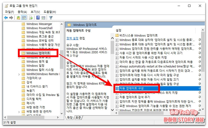 'Windows 구성요소' 항목 하위 폴더를 아래로 스크롤하고 'Windows 업데이트'를 찾았다면 클릭 후 오른쪽 화면에 나타나는 파일 중 '자동 업데이트 구성'을 누른다.