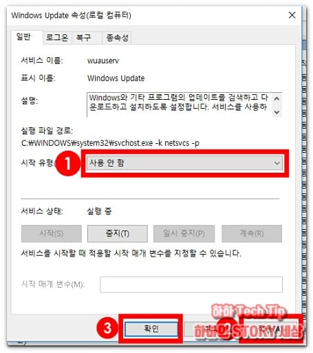 Windows Update 속성 창에서 시작 유형 항목을 '사용 안 함'으로 변경하고 적용 후 확인을 누른면 윈도우10 업데이트를 간단하게 끌수 있다.
