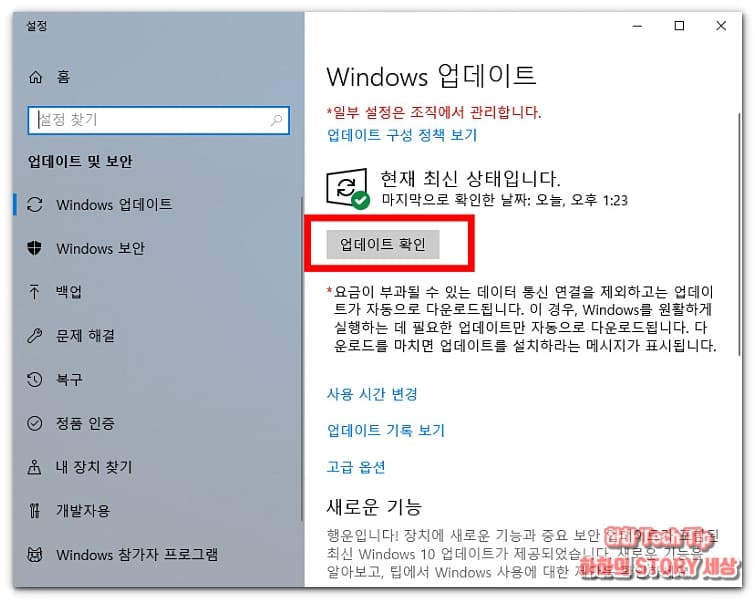 설정 창이 나타나면 오른쪽 Windows 업데이트 항목에서 '업데이트 확인'을 누른다.