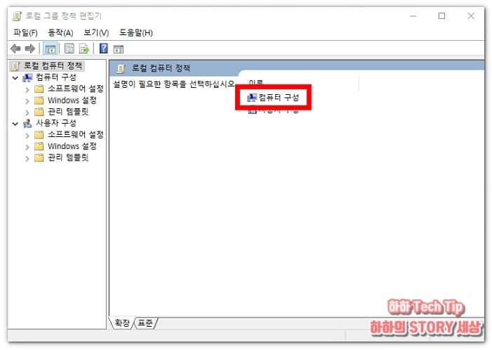 로컬 그룹 정책 편집기 창이 나타나면 오른쪽 '컴퓨터 구성'을 클릭한다.