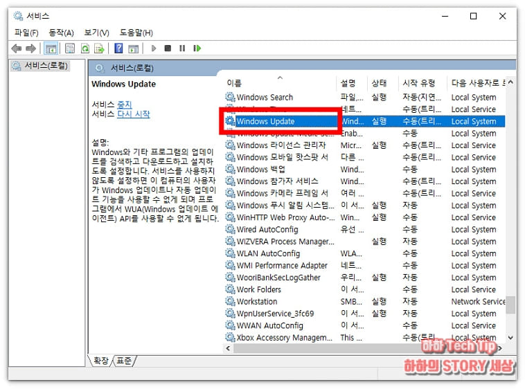 서비스 창 오른쪽 화면에서 'Windows Update'를 클릭한다.