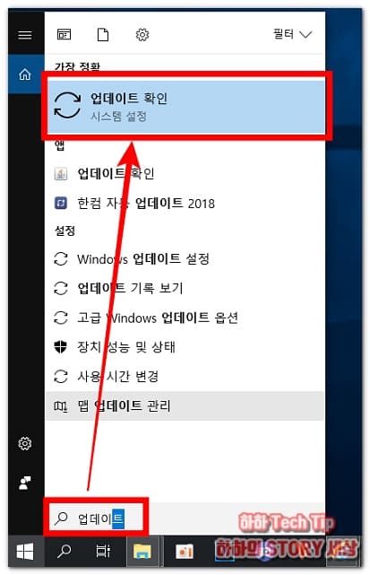 검색 칸에 '업데이트'를 입력하면 상단에 '업데이트 확인'이 표시되는데, 이 부분을 클릭한다.