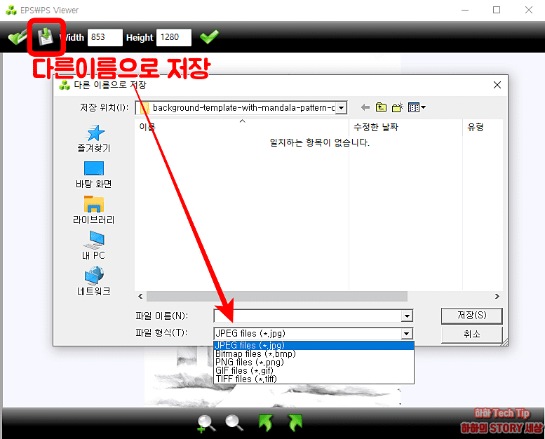 두 번째 다른 이름으로 저장은 원본 파일이 가지고 있던 것을 다른 형식으로 변환해 저장해주는 기능으로 JPEG, Bitmap, PNG, GIF, TIFF 5가지로 변경이 가능하다.