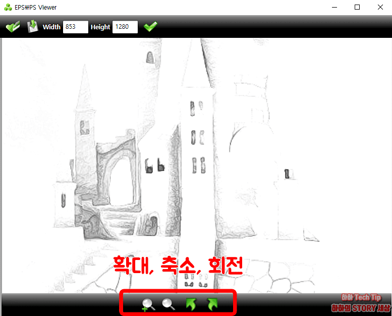 하단 인터페이스는 확대, 축소, 회전(좌/우)이 가능하며, 확대가 필요한 경우 화면처럼 자세히 확인할 수 있다. 편집 및 수정 또는 다른 형식으로 변경이 필요할 때 별도의 추가 비용 없이 사용할 수 있는 무료 뷰어를 이용하면 편리하다.