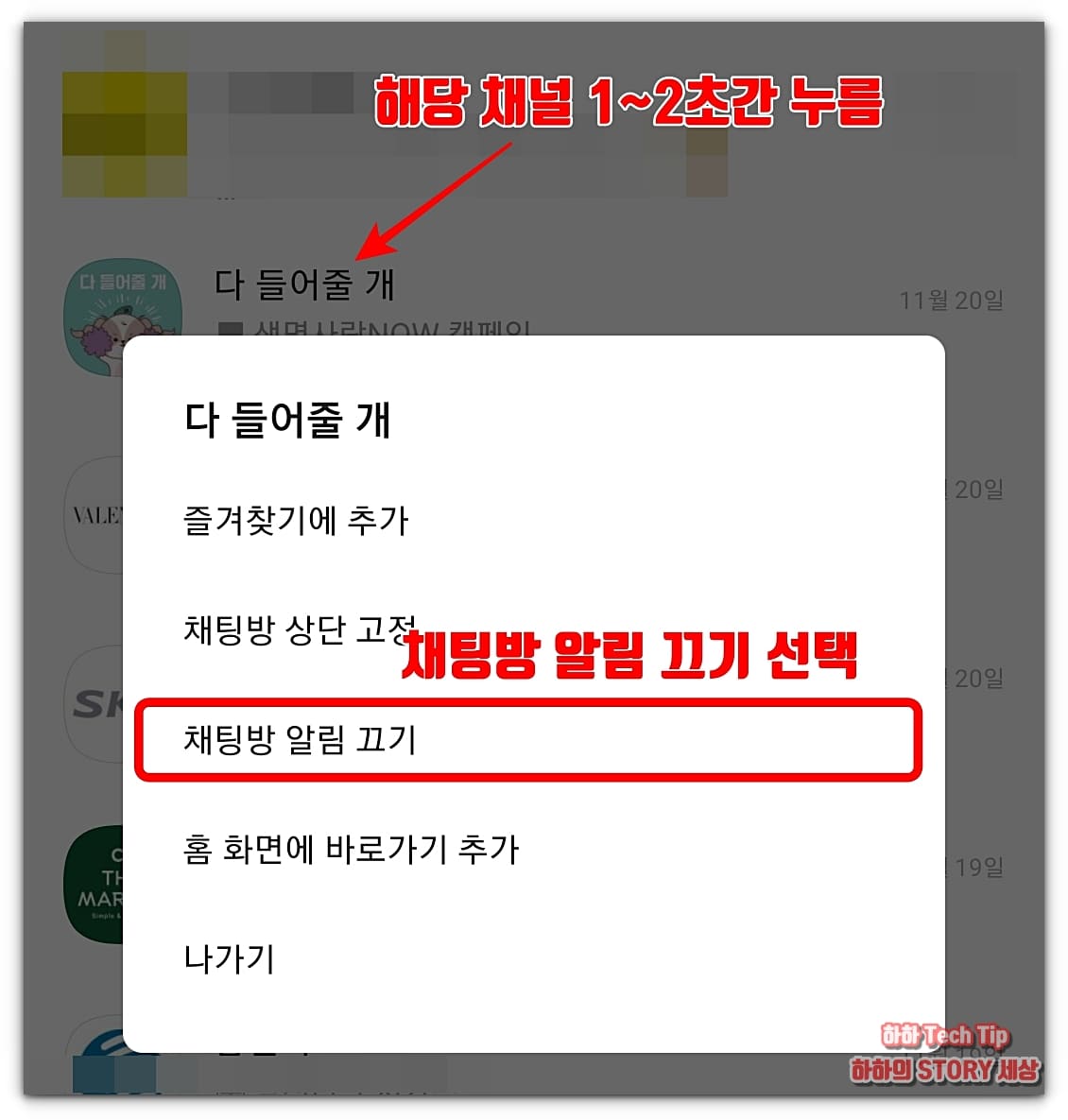 이 방법 이외에도 해당 채널을 1~2초 동안 누르고 있으면 추가 옵션이 나오는데, '채팅방 알림 끄기'를 선택하면 된다.