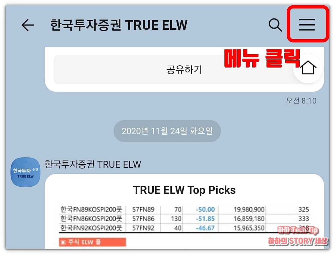 알람을 끄고자 하는 그룹방 또는 Channel을 선택해서 채팅창으로 이동 후 오른쪽 상단 메뉴 버튼을 클릭한다.