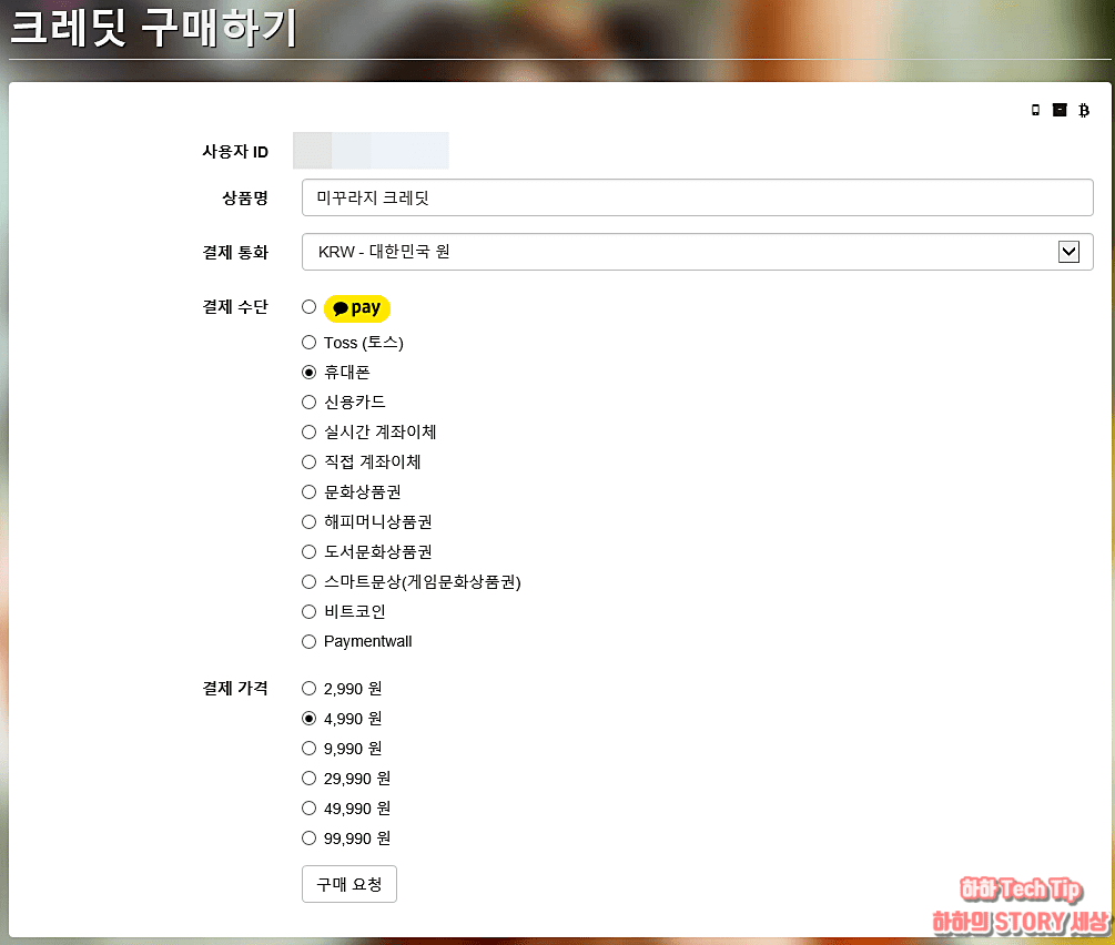 아이템 구매를 위한 창은 크게 자동갱신, 서버위치, 중계서버 3가지로 구분된다. 자동갱신은 아이템 유효기간 종료 전 자동으로 갱신되는 기능인데, 자동결재가 될 수 있으니 사용안함으로 선택하는 것을 추천한다.