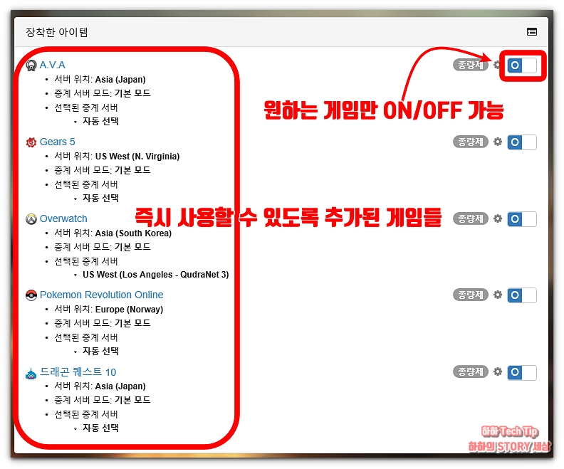 금액권 결재를 마쳤다면 아이템 구매(Game) 단계로 이동한다. 플레이어가 게임을 할때마다 가상 네트워크를 활성화하고 다시 게임을 선택한다면 유저 입장에서는 매우 불편할 것이다. 하지만 미꾸라지는 자주 사용하는 Game을 한번만 등록하면 ON/OFF 스위치로 간단히 끄고 켤 수 있다.