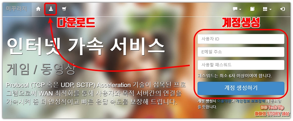 시작 전 메인화면에서 사용자 ID, 이메일 주소, 비번번호 입력 후 계정 생성하기를 눌러 회원가입 후 왼쪽 상단에 보이는 다운로드를 클릭한다.