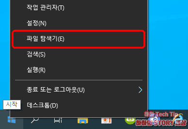 첫번째는 사용 중인 OS, CPU, RAM 등의 기본 정보를 확인할 수 있는 방법으로 왼쪽 하단에 위치한 윈도우 아이콘을 마우스 우클릭 후 나타나는 메뉴 중 파일 탐색기를 클릭한다.