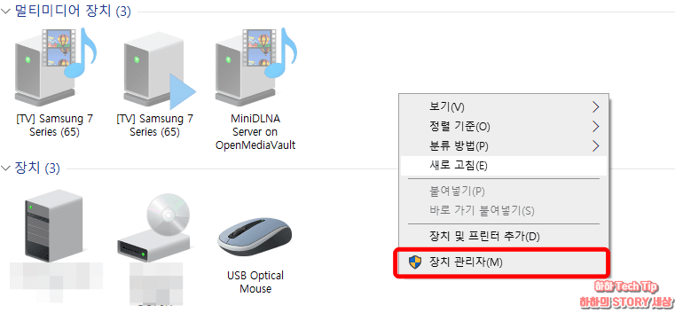 장치 및 프린터 화면 빈 공백을 마우스 우클릭 후 장치 관리자를 클릭한다.