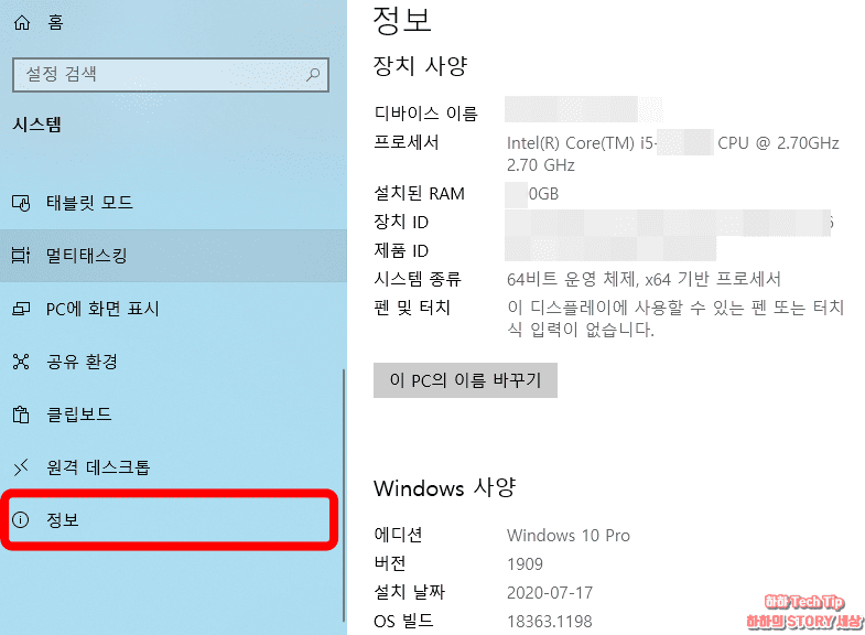 설정 창 하단으로 이동하면 좌측 하단 마지막에 정보 항목을 클릭한다. 오른쪽 화면에 사용자의 장치 사양이 나타나며, 파일 탐색기와 다른 점이라면, Windows 사양이 좀 더 자세하게 나타나서 버전, 설치 날자, OS빌드, 서비스팩 등을 확인할 수 있다.