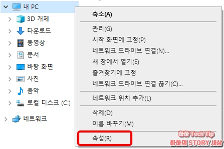 파일 탐색기 창에서 내 PC 아이콘을 찾아 마우스를 이동 후 우클릭 → 속성 항목을 선택한다.
