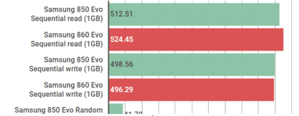 850EVO와 860EVO를 비교하는 자료가 있어 발췌를 하였는데, 성능적으로 크게 차이가 나지 않는 것으로 보인다.
