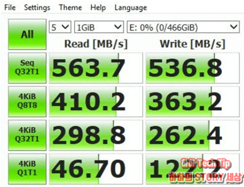 CrystalDiskMark로 확인한 결과 Seq(Q32T1) 읽기 563.7MB/s 쓰기 536.8MB/s, 4Kib(Q8T8) 읽기 410.2MB/s 쓰기 363.2MB/s, 4KiB(Q32T1) 읽기 298.8MB/s 쓰기 262.4MB/s, 4KiB(Q1T1) 읽기 46.70MB/s 쓰기 122.2MB/s로 측정되었다.