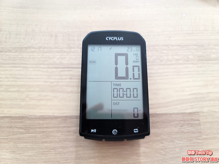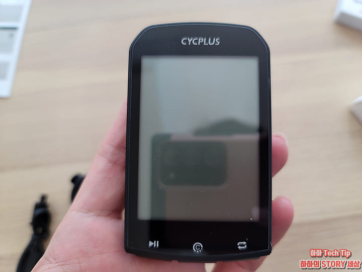 기기 좌측 하단을 길게 누르면 전원을 켤 수 있으며, 다시 동일한 동작 시 기기가 OFF 된다. 첫 화면에서 보게 되는 정보는 좌측 상단부터 시계방향으로 현재시간, GPS 수신, 온도, 배터리, 주행시간, 주행거리, 파워미터, 케이던스, 심박수, 현재 속도를 표시한다.