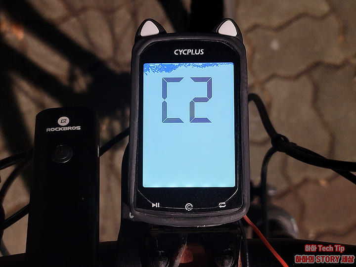 스피드, 케이던스, 파워미터와 같은 센서를 연결하려면 기기와 연동을 시켜야 하는데, 우측 버튼을 길게 눌러서 C2 화면으로 이동한다. 이 상태에서 좌측 전원 버튼을 눌러 센서 추가 모드로 진입 후 다시 한번 좌측 버튼을 누른다.