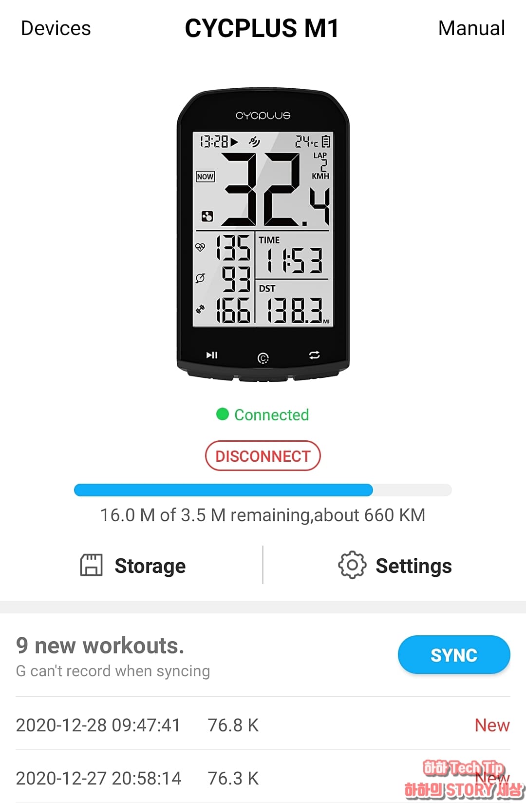 주행을 마쳤다면 중앙 버튼을 5초간 길게 눌러 기록을 기기에 저장할 수 있는데, 200시간까지 기록할 수 있는 메모리를 가지고 있어 3달여 동안 한번 삭제했으며, 메모리로 인한 불편은 없다.