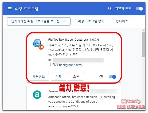 Pig Toolbox(Super Gestures) 1.0.7.6 확장 프로그램이 정상적으로 등록되며, 설치가 끝난다. 그런데 간혹 오류로 등록이 되지 않는 경우가 있는데 개발자 모드 비활성화 → 확장 프로그램 로드 → 압축해제 폴더 선택을 반복하면 제대로 설치가 된다.