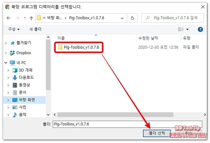 확장 프로그램 디렉터리 선택창에서 좀 전에 압축해제했던 툴박스 폴더를 선택한다.