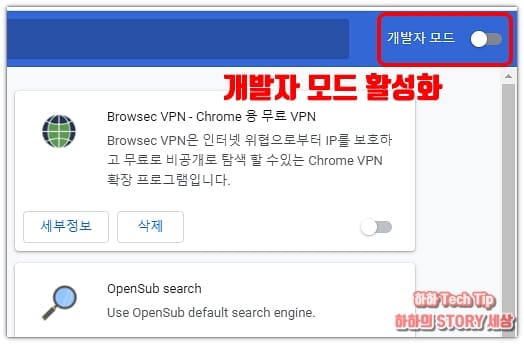 확장 프로그램 창으로 이동하면 현재 크롬에서 사용 중인 Program들을 확인할 수 있는데, 검색이 되지 않는 툴박스를 강제로 추가하기 위해서 우측 상단에 보이는 개발자 모드를 마우스 클릭하여 활성화 한다.