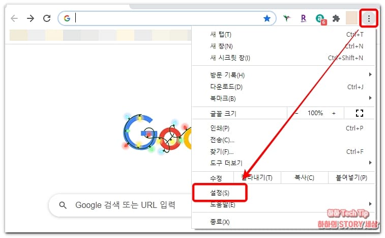 크롬 브라우저를 실행 후 우측 상단 Chrom 맞춤설정 및 제어(점세개)를 클릭해 설정 항목을 선택한다.