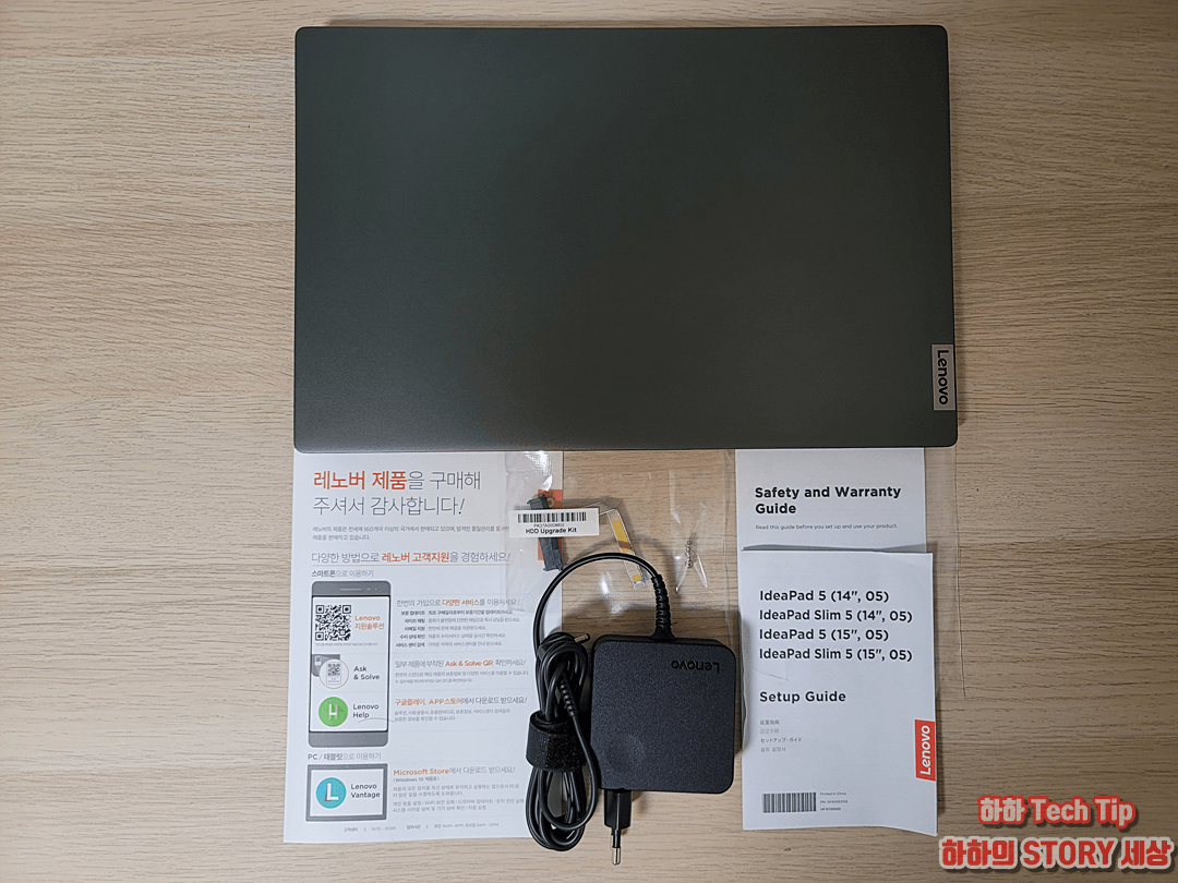 아이디어패드 슬림5 15ARE 노트북은 본품, 충전기, 고객지원 안내문, 셋업 가이드, 안전 및 보증 가이드, 확장 DIY킷 6개로 구성되어 있다.