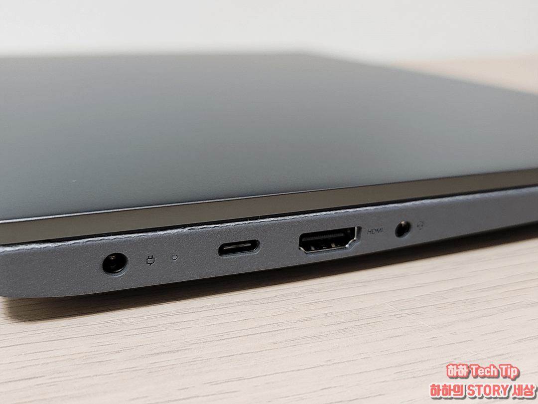왼쪽 측면에는 전원단자, USB-C, HDMI, 헤드폰 마이크 콤보잭이 위치한다. 최신 노트북에서 지원하는 USB-C 타입 단자는 PD(Power Delivery) 충전이 가능해 컴팩트한 충전기로 이동 시 어댑터로 인한 무게를 현저하게 줄일 수 있다.