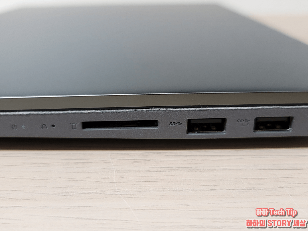 오른쪽 측면에는 USB 3.1 포트 X 2EA, SD 카드리더가 위치해 있으며, USB 포트는 Gen1을 지원해 최고 5Gb/s 전송속도로 메모리, 외장하드에 있는 자료를 빠르게 이동할 수 있다.