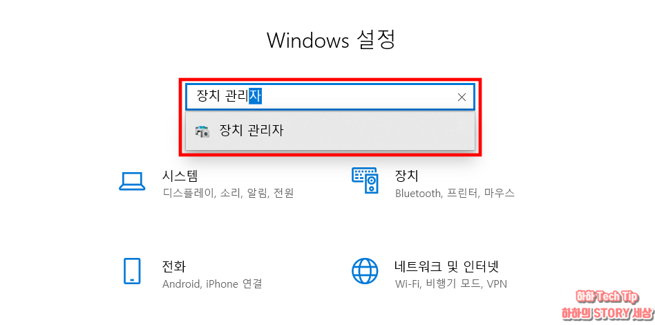 Windows 설정 검색창에서 장치 관리자(띄어쓰기 필수!) 입력 후 아래에 나타나는 글자를 클릭한다.