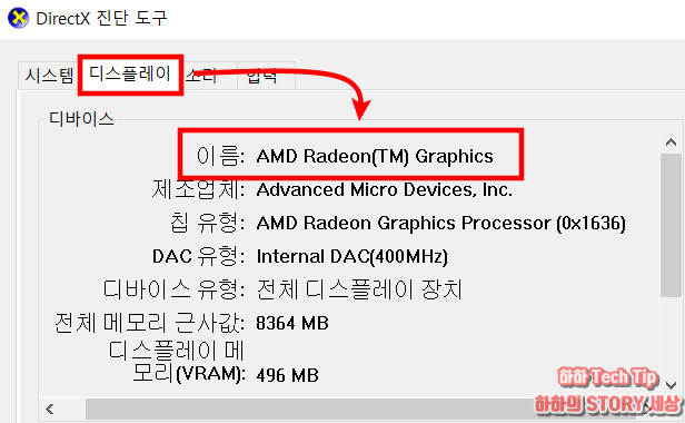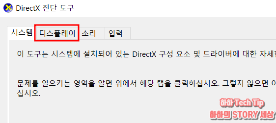DirectX 디지털 서명 유무를 체크하면 진단도구 창이 나타나는데, 디스플레이 탭을 선택한다.