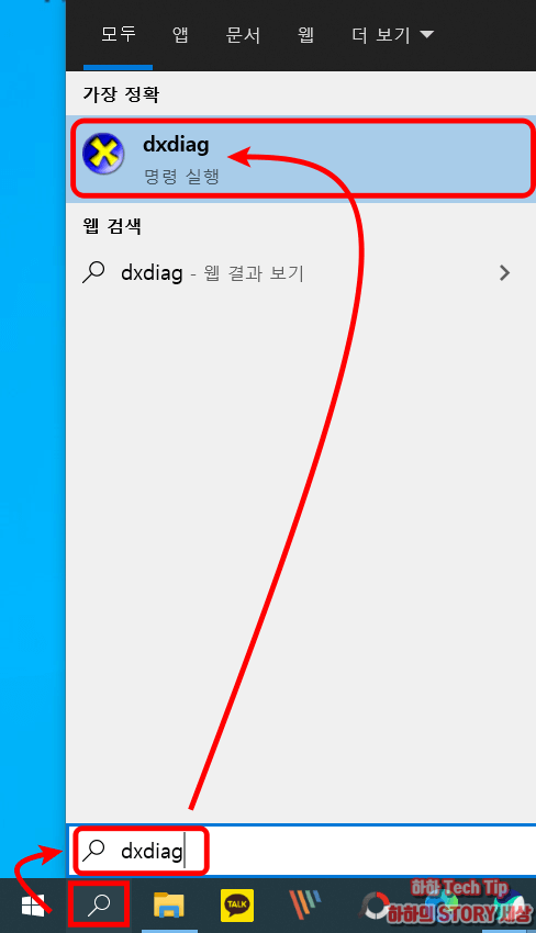 다이렉트X 진단도구를 통해 확인하는 방법으로 바탕화면 하단 작업표시줄에서 검색(돋보기)을 클릭한 뒤 dxdiag 타이핑 시 상단에 나타나는 아이콘을 누른다.