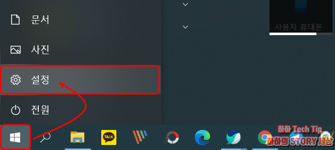 키보드 윈도우 버튼 클릭 또는 바탕화면 왼쪽 하단 윈도우 아이콘을 선택 후 설정을 누른다.