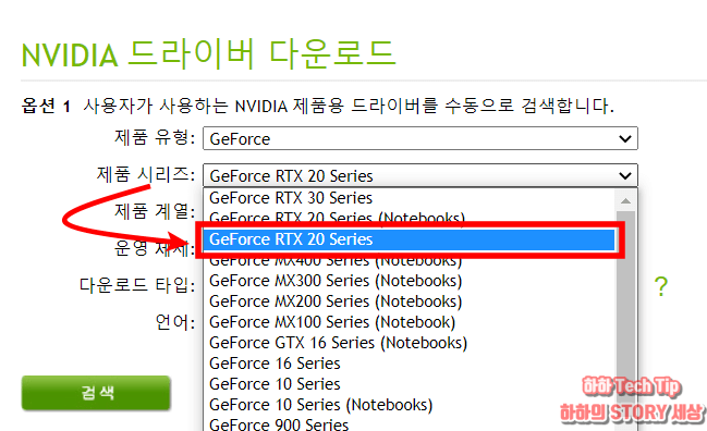 예를 들어 무조건 GeForce 선택하고 제품 시리즈는 자신이 가지고 있는 대표 모델명을 선택하면 되는데, GTX 1660이라면 16 series, 2070은 RTX 20 series를 고르면 된다.