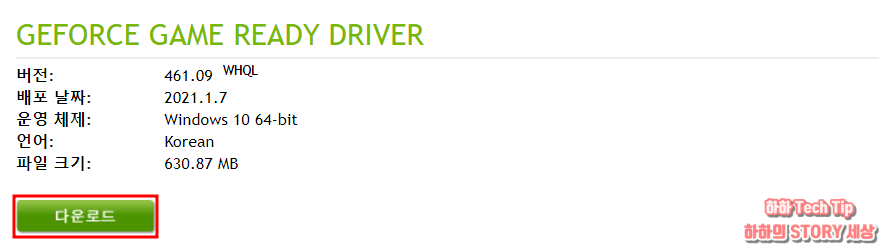 배포 창으로 넘어가면 GEFORCE GAME READY DRIVER 버전 및 배포 날짜 등 간단한 정보가 보이는데, 아래에 있는 다운로드 아이콘을 클릭한다.