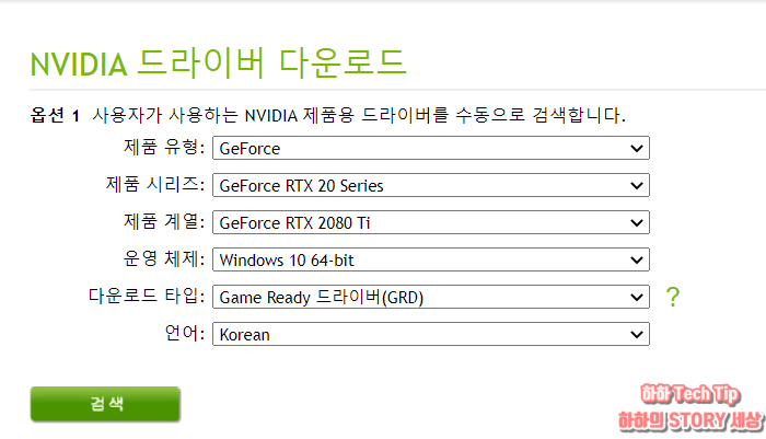 NVIDIA 드라이버 다운로드 창이 나타나면 옵션 1에서 제품 유형, 제품 시리즈, 제품 계열, 운영체제 등을 선택 후 하단에 보이는 검색을 클릭한다.