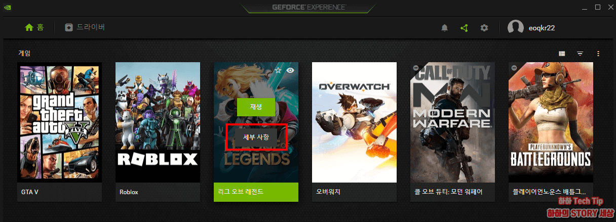 메인 화면에서 설정하고자 하는 게임으로 마우스를 이동해 세부사항이 나타나면 이것을 클릭한다.