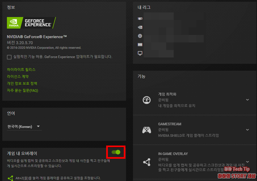 일반 카테고리에서는 게임 최적화, 게임스트림, 인게임 오버레이 상태 등을 확인 할 수 있는데, 좌측 하단에 보이는 게임 내 오버레이 버튼을 클릭해 활성화 한다.
