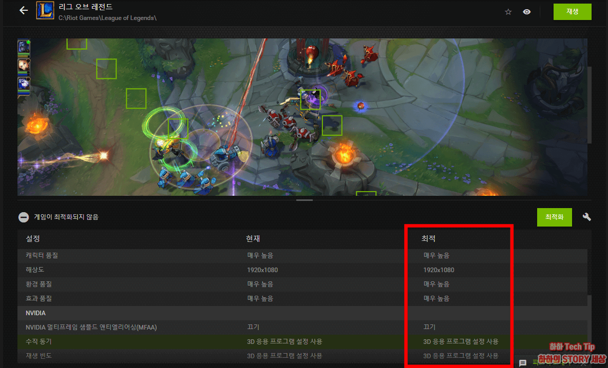 최적화 상태로 변경하고 싶다면 최적으로 마우스를 옮겨 클릭하면 즉시 적용된다.