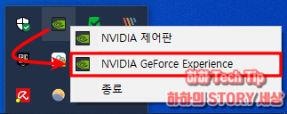 설치를 마쳤다면 바로가기를 실행하거나 오른쪽 하단 숨겨진 아이콘 표시를 눌러 NVIDIA 마크를 찾아 마우스 우클릭 후 NVIDIA GeForce Experience를 선택한다.