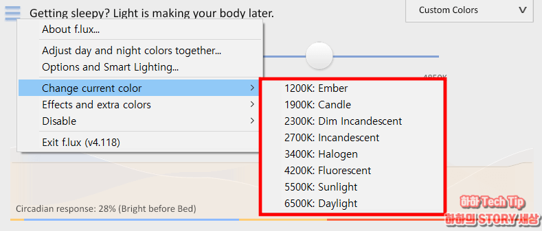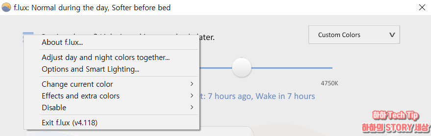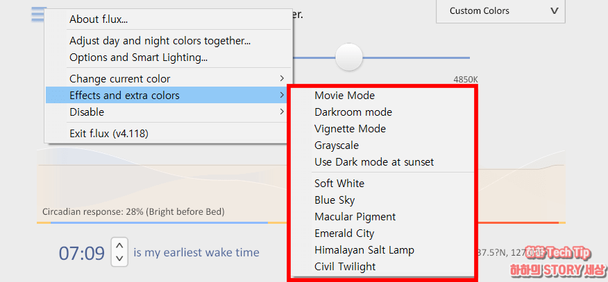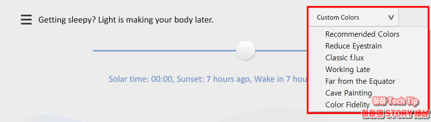 가장 빠르고 효과적으로 블루라이트 차단 효과를 사용할 수 있는 기능으로 Recommended Colors, Reduce Eyestrain, Classic f.lux, Working Late 등이 있다.