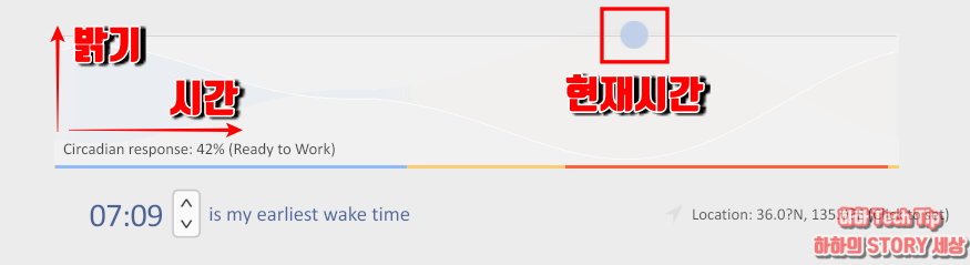 기상시간을 어떻게 설정하느냐에 따라 밝기가 정해지는데, 늦은 시간 컴퓨터 작업으로 인해 빛으로 수면 장애가 올 수 있기에 프로그램은 자동적으로 모니터 광원을 줄인다.