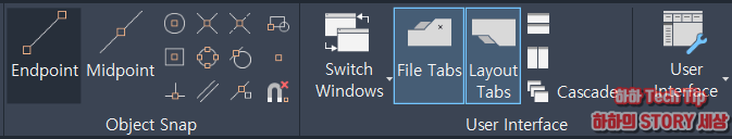 일곱 번째 화면상에서 파일 탭과 레이아웃 탭을 보이거나 숨길수 있고 유저 인터페이스에서는 View cube, navigation bar, Showmotion 선택 및 해제가 가능하다.